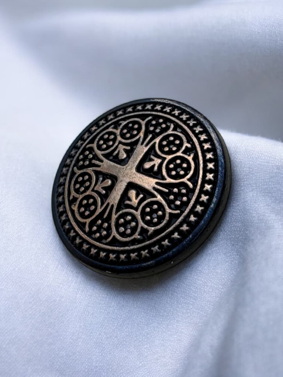 Add a strong heritage statement to your garments with this antique-finish metal button, featuring a bold cross-inspired embossed motif surrounded by intricate ornamental detailing. The textured surface and circular pattern give it a rich vintage and handcrafted appeal.