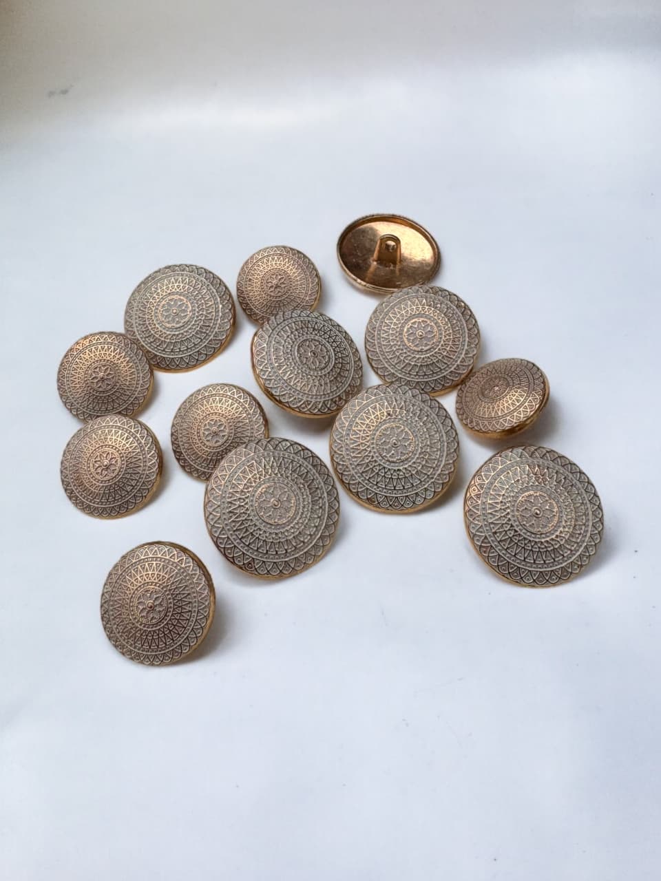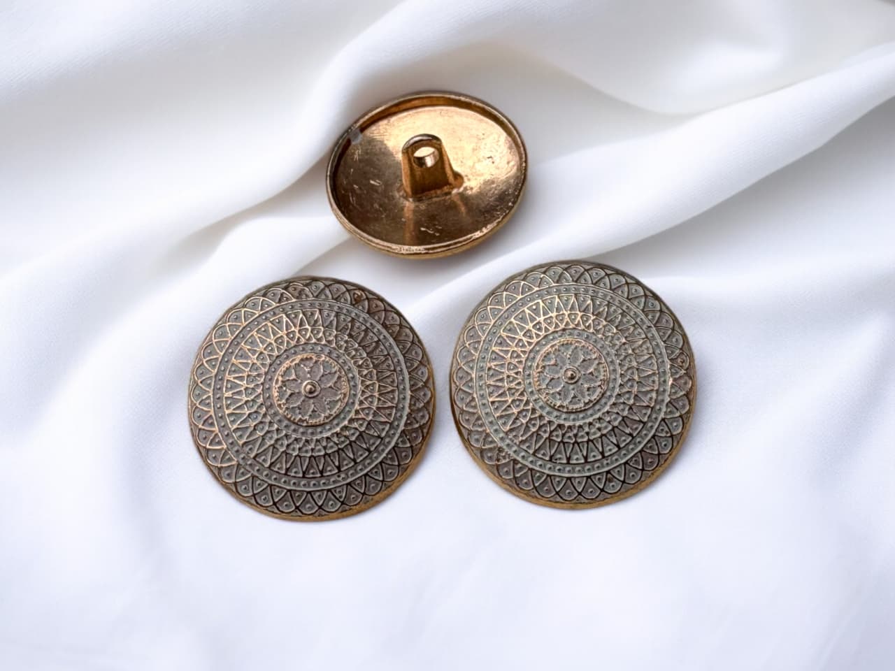 Bring a touch of traditional elegance to your garments with this antique-finish metal button, beautifully crafted with a detailed mandala-inspired embossed pattern. The concentric circular design features intricate geometric and floral elements, giving it a rich heritage and handcrafted appearance.