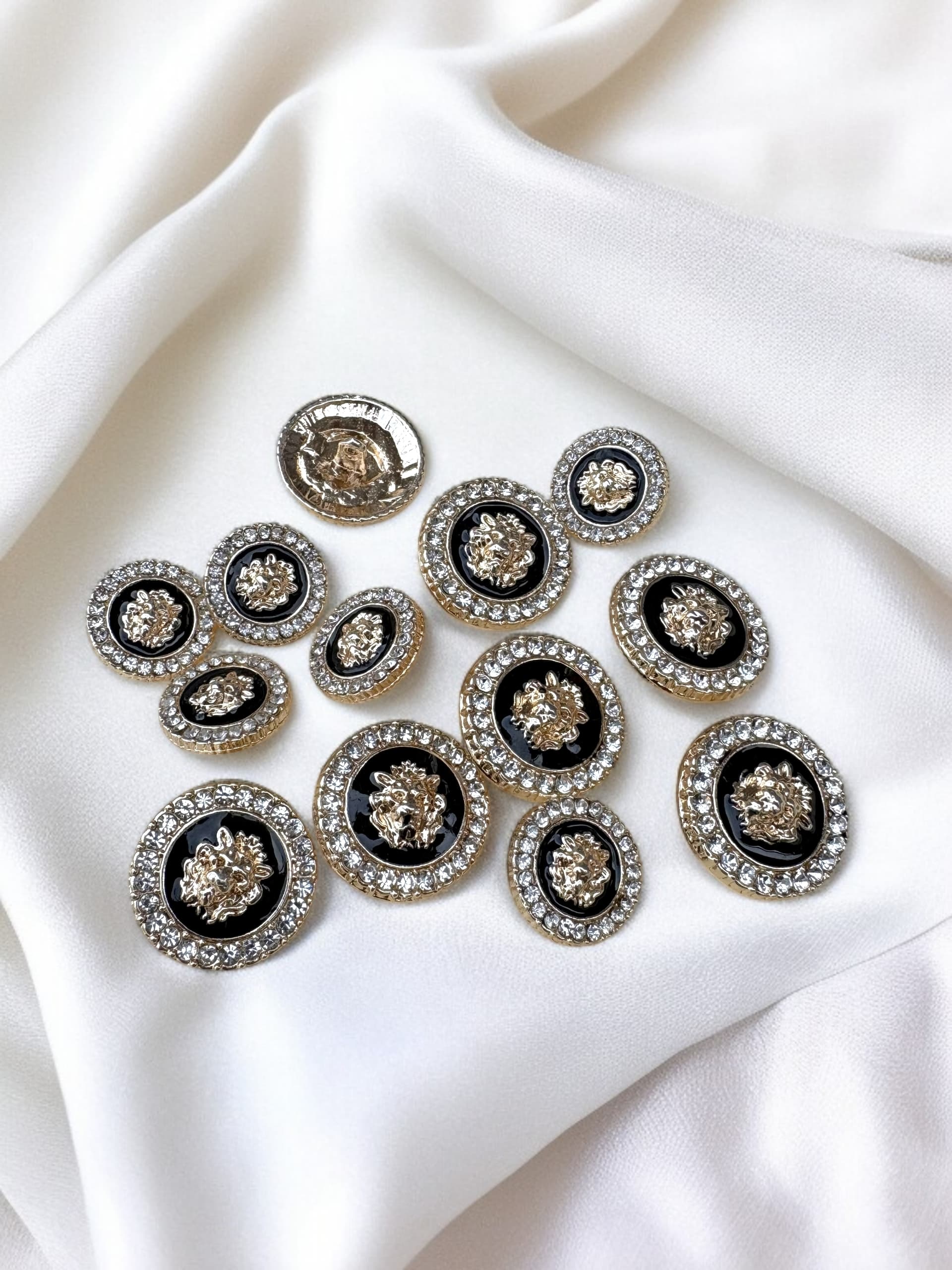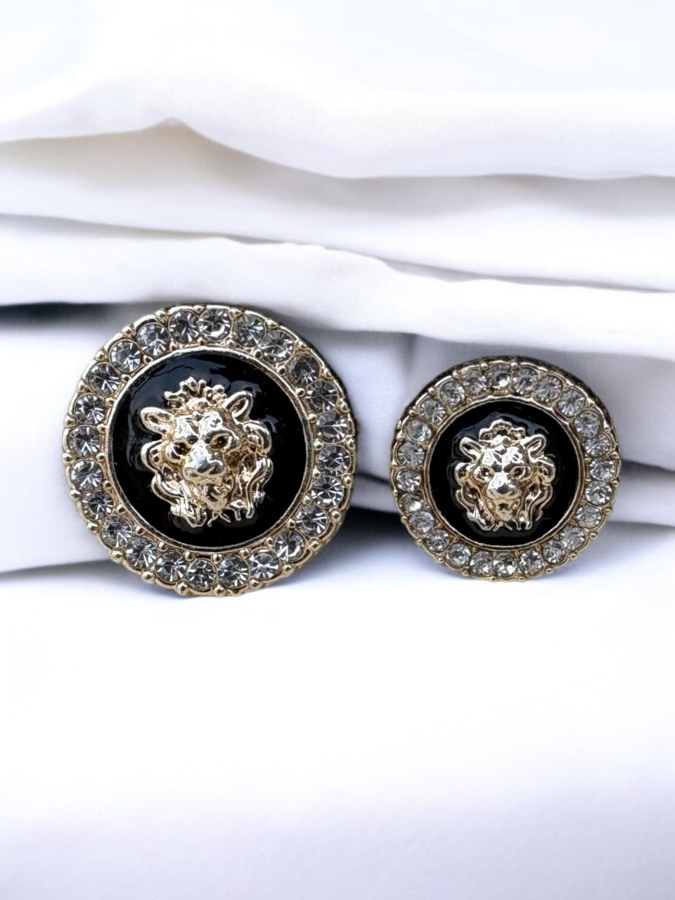 Make a powerful style statement with this luxury black enamel metal button, featuring a striking gold-tone lion head motif at the center. The bold emblem symbolizes strength and elegance, set against a glossy black enamel base and framed with a sparkling crystal-studded circular border.