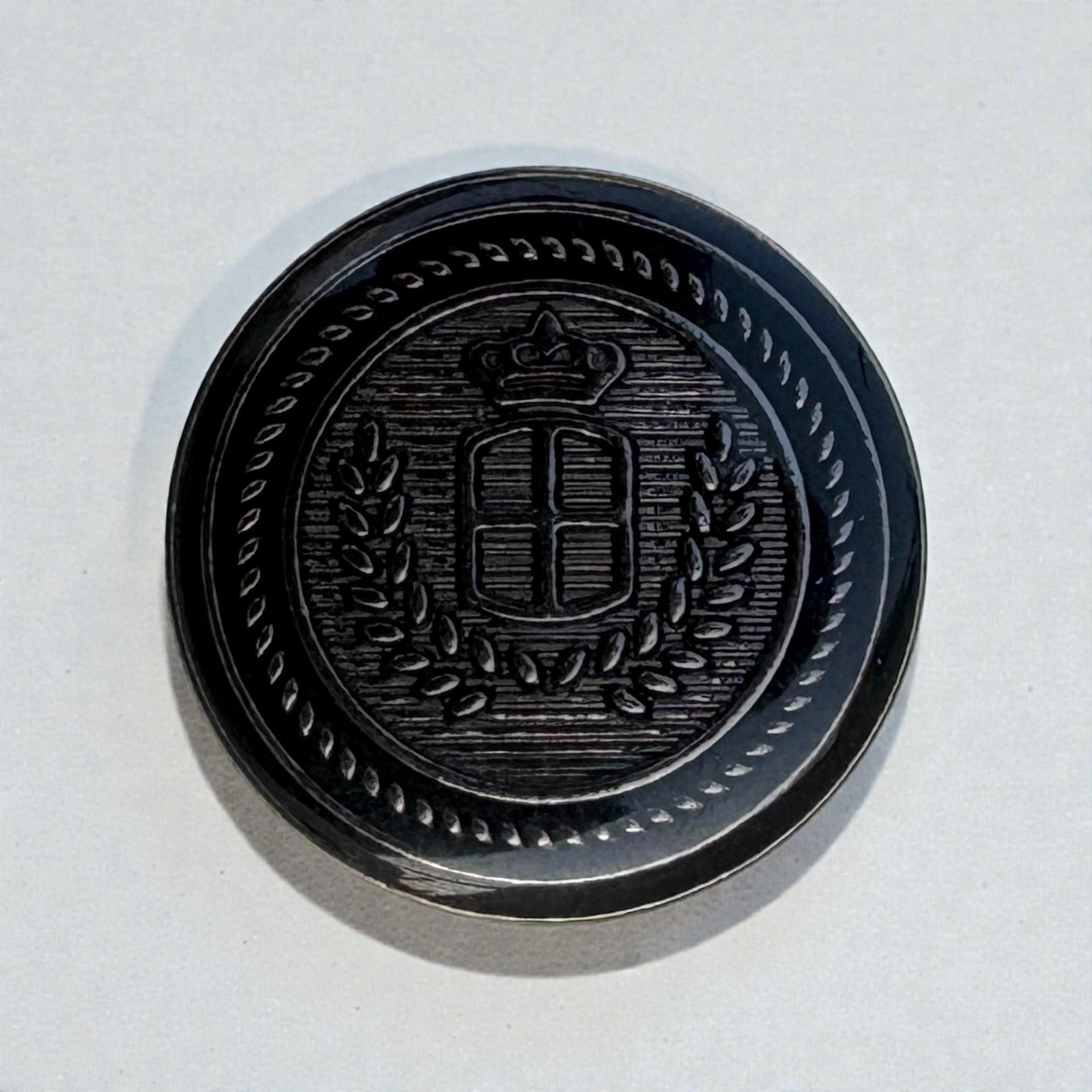 Add a timeless, regal touch to your garments with this classic crown crest metal button. Featuring an embossed shield topped with a crown and framed by laurel branches, this button brings a refined, heritage-inspired look to coats, blazers, uniforms, and craft projects.