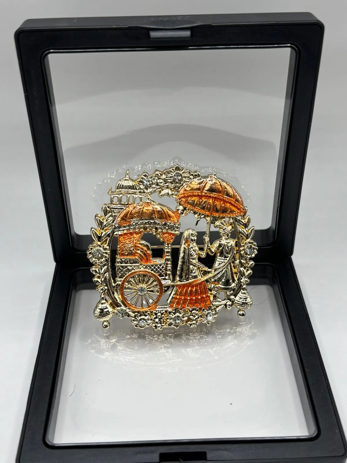 Celebrate the grandeur of Indian weddings with the Dulheo Royal Wedding Dulha Brooch, a masterpiece inspired by traditional bridal processions. This intricately designed brooch showcases a bride and groom under ornate umbrellas with a classic rickshaw motif, symbolizing heritage, love, and royal elegance.