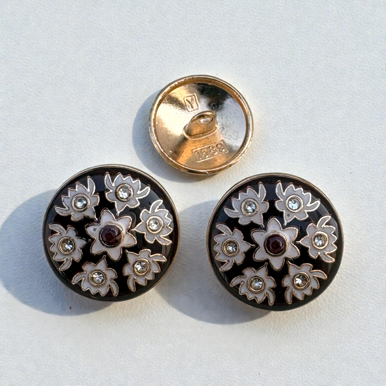 Be the first to review “Luxury Black Floral Rhinestone Shank Button – Gold Trim with Red Crystal Center”