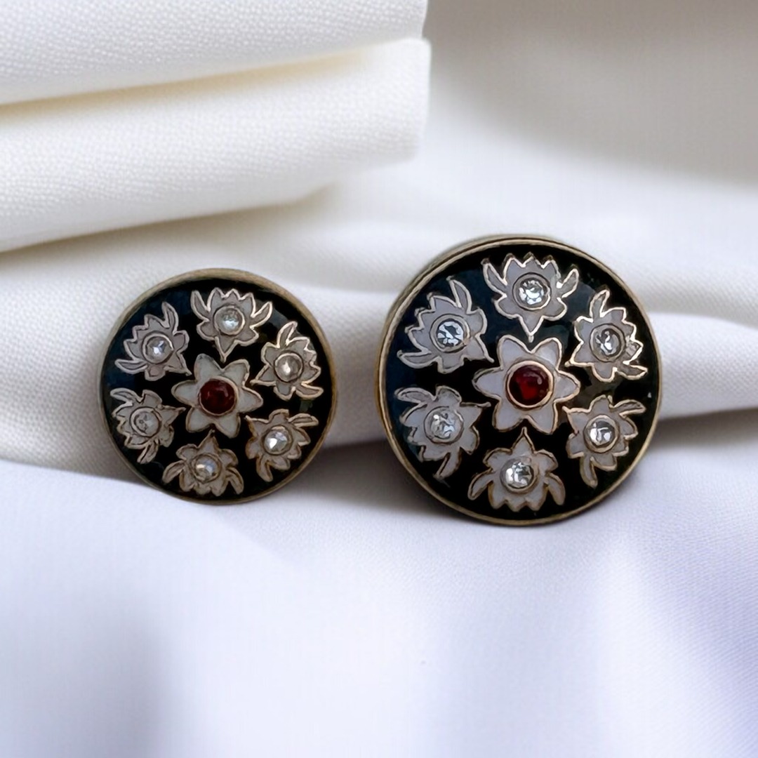 Elevate your designs with this stunning luxury floral button, crafted to bring timeless elegance and refined detail to any garment. Featuring a rich black enamel background framed with a polished gold-tone rim, this round decorative button showcases an intricate floral arrangement highlighted with sparkling clear rhinestones.