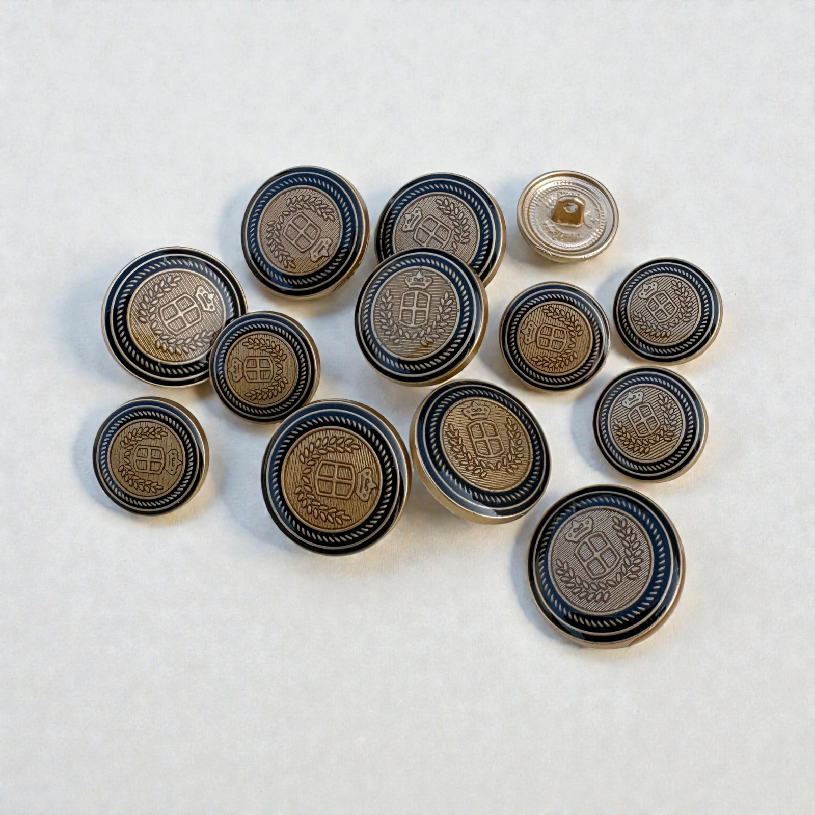High-quality metal shank button with embossed crown and shield crest, laurel wreath detailing, two-tone antique finish, round shape, rope-edge border, durable construction, smooth polished edges, strong rear shank for sewing, suitable for coats, blazers, jackets, uniforms, tailoring, sewing, crafts, and decorative use.